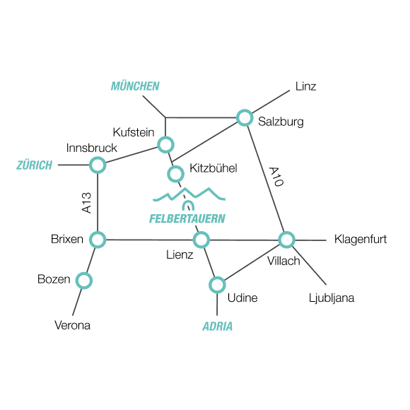 - Ausschilderung „Felbertauernstraße“, über Kitzbühel nach Mittersill